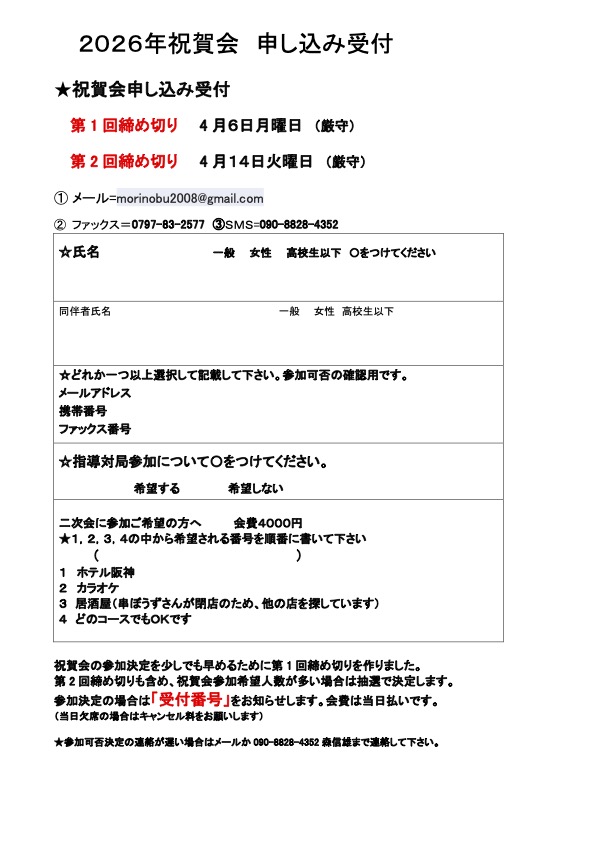 今年も森一門祝賀会を5月3日にホテル阪神で催します。今期は弟子の活躍も多くて勝負に熱が入りました。
