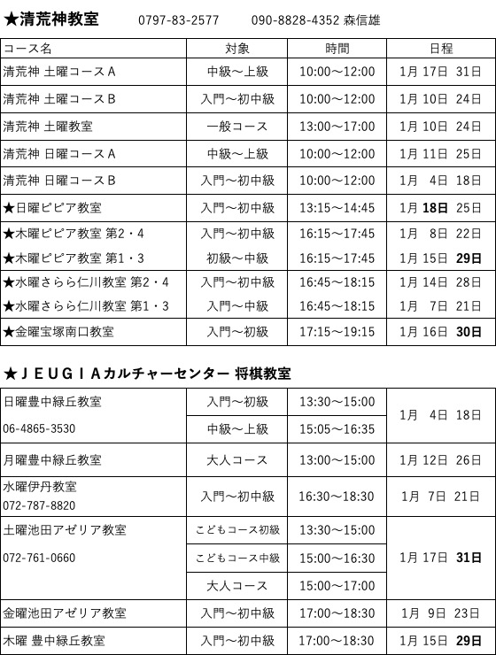 【11月各教室日程】 上記のスケジュール表にてご確認ください。 11月のさらら仁川教室はピピアめふ教室に変更です。16:15〜17:45 11月のみ上記の理由で毎週「水曜ピピア」開講で、他コースからの追加、振替も可能です。 講師は森信雄七段が担当します。 【... -